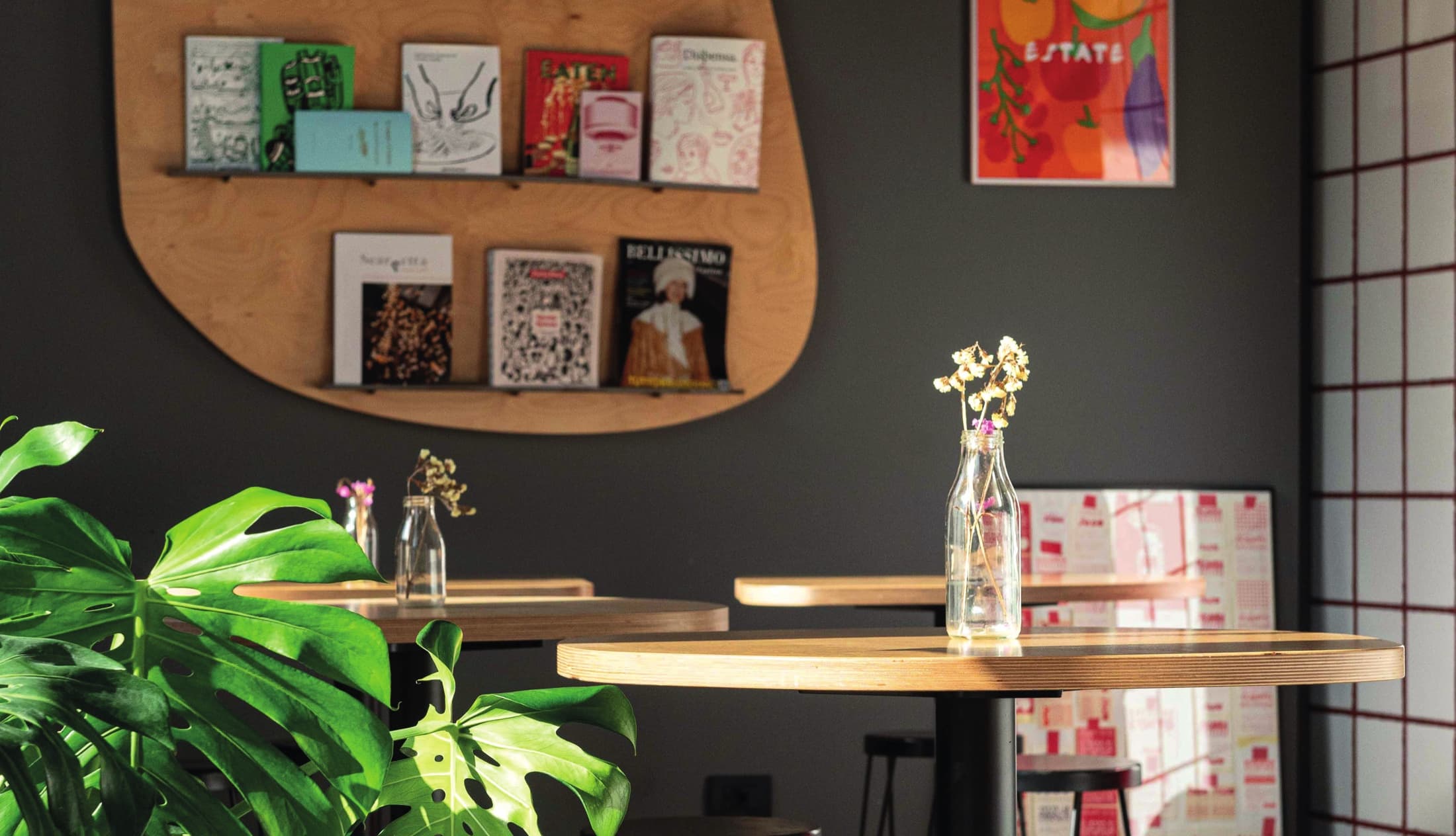 Il controsoffitto, lasciato volutamente scoperto, rende omaggio alla storia tessile di Prato; lampade metalliche vintage diffondono una luce calda sui tavoli di legno, mentre mensole modulari ospitano prodotti di filiera corta scelti con cura. Il pavimento in cemento grezzo dialoga con l’acciaio, creando un equilibrio visivo in cui l’essenzialità industriale è addolcita da texture naturali e da una palette intima.