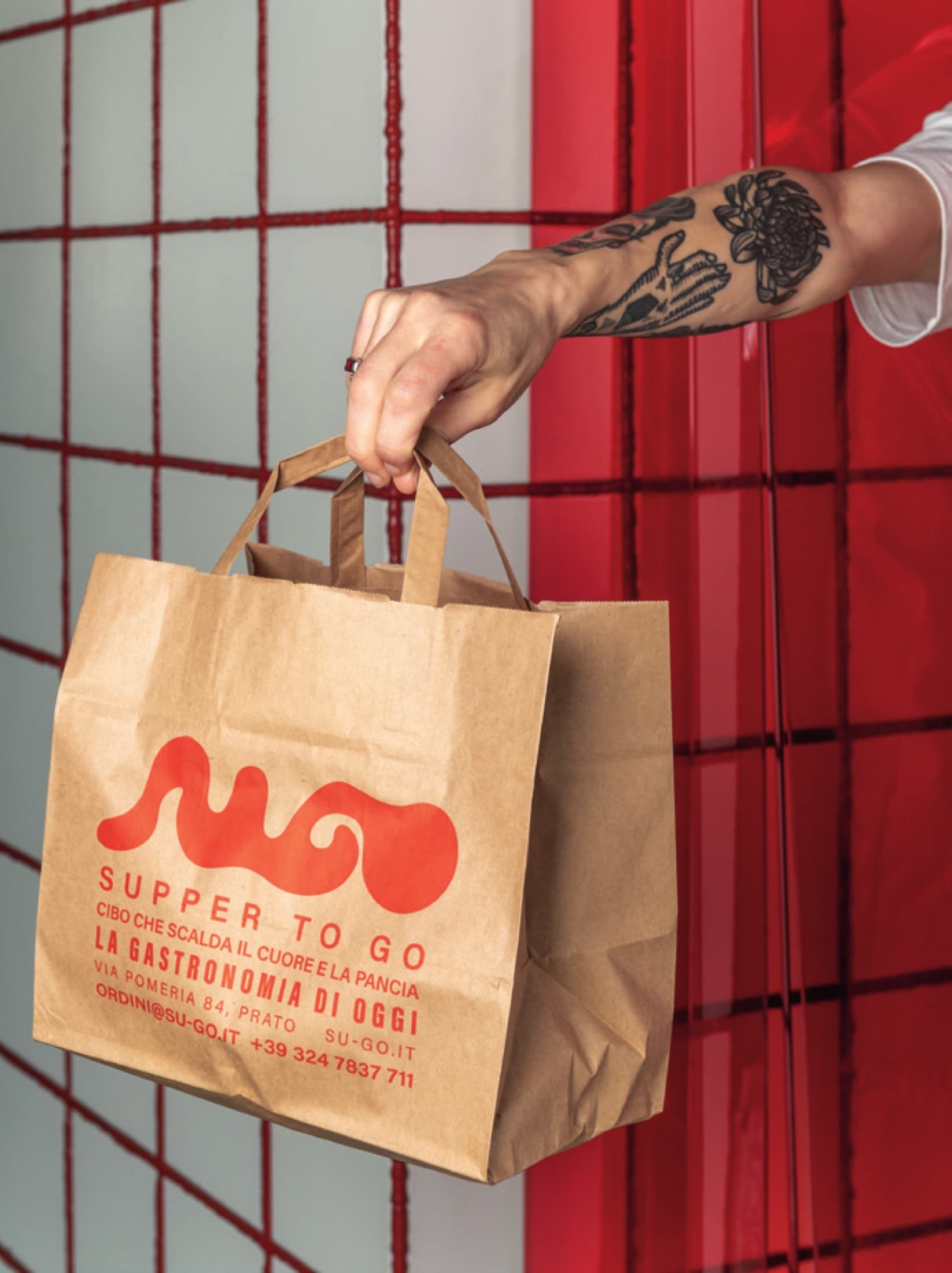 Questa coerenza formale si riflette anche nei gesti quotidiani. In cucina abbattitori di temperatura, forni intelligenti che cuociono a bassa temperatura, conservando tenerezza, sapore e valori nutrizionali, e software di tracciabilità lavorano dietro le quinte; il calore che anima il progetto, però, è ancora quello che un tempo ardeva nelle cucine delle nonne. Così Su.Go diventa un piccolo hub di sostenibilità urbana: packaging compostabile, vuoto a rendere e una partnership con realtà impegnate contro lo spreco, traducono un’etica in azioni tangibili, mentre il racconto trasparente dei produttori coinvolti invita i clienti a un consumo consapevole. Mangiare qui non Piastrelle a griglia rossa, acciaio lucido e scaffali colmi: l’interno di Su.Go mescola anima industriale e accoglienza domestica, mentre la shopper “Supper To Go” promette di portarne via un assaggio.